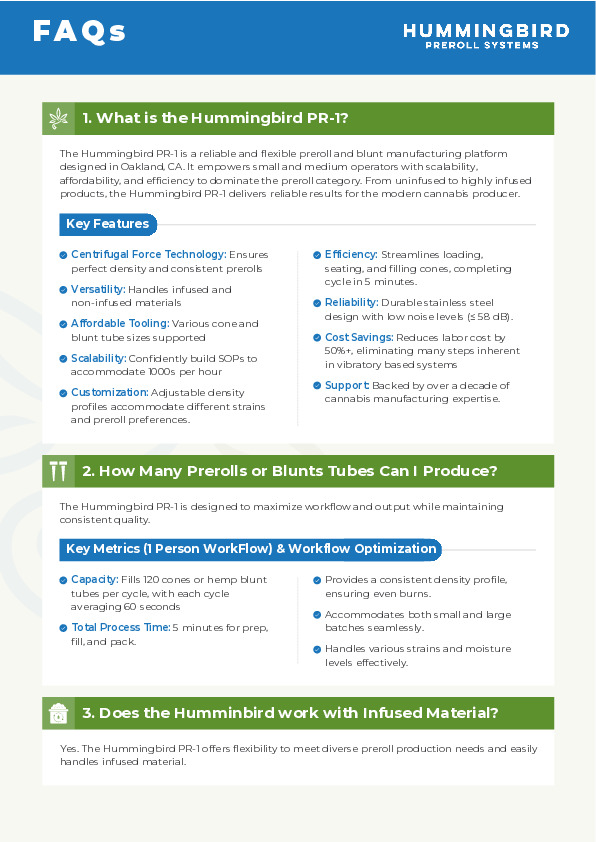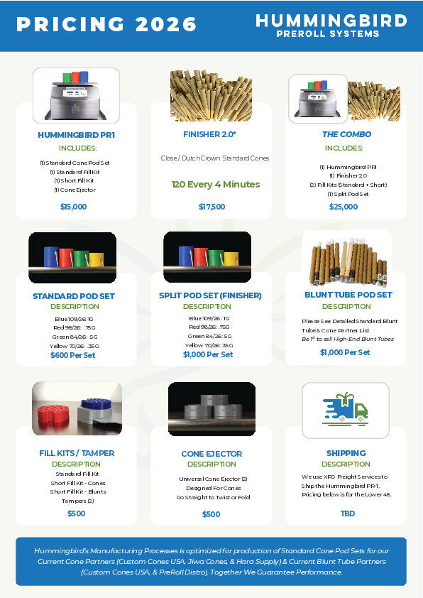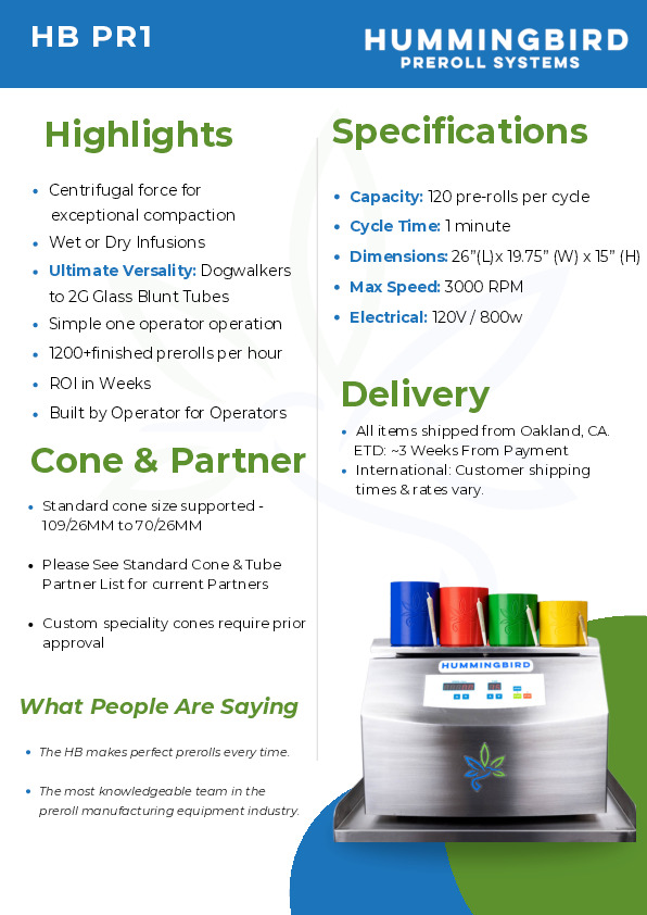 What we offer:We are Hummingbird Preroll Systems, offering the most complete and affordable solution on the market for small to high-volume producers. From dog walkers to large-scale manufacturers, our machines provide unmatched versatility and efficiency.